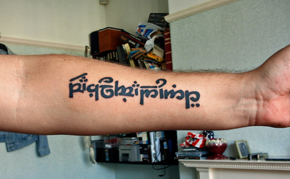 The first customer wants to make sure I get it exactly right. It’s a tattoo after all, so I can’t blame them, but sometimes they harangue me about Elvish grammar and orthography and agonize that they might be laughed at by an Elf on the subway someday. They don’t need me to tell them that Tolkien’s trilogy is a work of fiction, and yet there is something terribly important about knowing that the elegant script they receive is genuine. But genuine what?