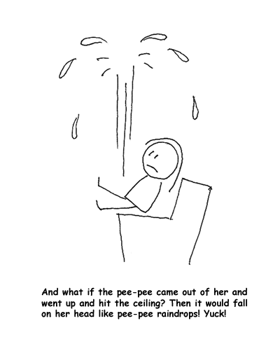 Let me begin by declaring that my daughter Carolyn can now pee-pee on the potty. But there was a stretch there when things weren’t going so well. She thoroughly despised the toilet, our encouragement notwithstanding. We tried many variations, but with no success. Then my clever wife observed that a little story might help move things along. She wrote it, and I was enlisted to illustrate it. In order to take the edge off a little bit, we gave the lead role to one of my daughter’s imaginary friends, Marilyn (Marilyn lives in Carolyn’s mirror).