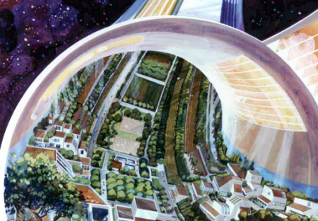 In the mid 1970s there was a bloom of space colony utopianism that grew under the leadership of Gerard K. O’Neill. NASA funded some significant studies, including this one from 1975: Space Settlements: A Design Study. The idea was to build a giant space station out between the earth and the moon at a place called the L-5 Lagrangian libration point. Enthusiasts coined the slogan “L-5 in 1995”, because surely only 20 years would be required to launch our first colony in space. There’s a lot of work in that study, but probably the most significant thing they did, from a PR point of view, was hire Rick Guidice and Don Davis to do the gorgeous paintings featured on the Boing Boing page. I remember staring at those images as a kid. And dig this scene from the study: