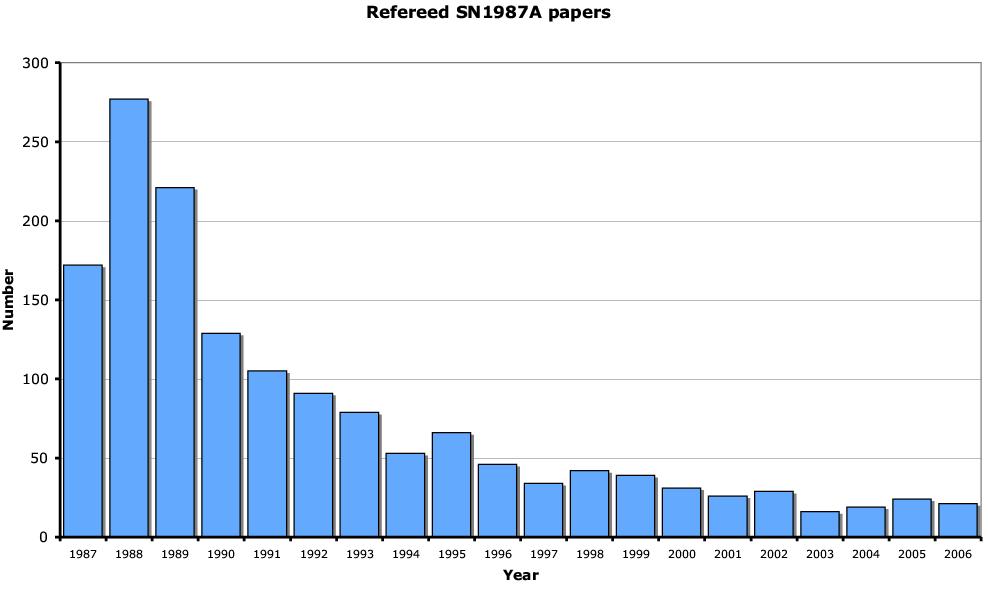 Physical events cause ripples in information space as well as physical space. For instance, every morning I pass a speed trap on the Massachusetts Turnpike. Usually there’s no cop there, but when there is one, I can detect him well before he sees me. I don’t have a radar detector. I just have to watch for people ahead of me slowing down in an odd way. I don’t see the cop, but I do see the information radiation that they shed: brake light enlightenment. Similarly, there was a famous supernova that was first observed in 1987. Cleverly, someone had the presence of mind to call it Supernova 1987A. But we could have detected approximately when it occurred anyway based on the huge spike in astrophysics papers mentioning the word “supernova”.