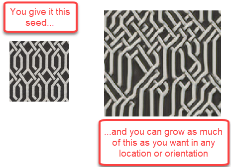 In the future, everything will be procedural. Architecture, silverware, clothing. If you want zebra stripes in your dining room, all you’ll need to do is specify exactly the area that you want to cover. Then you can just drop a zebra pattern seed in the lower left corner and wait. But we can do the zebra one better. If, next week, you decide it should be a giraffe-themed dining experience, just drop in a giraffe seed.