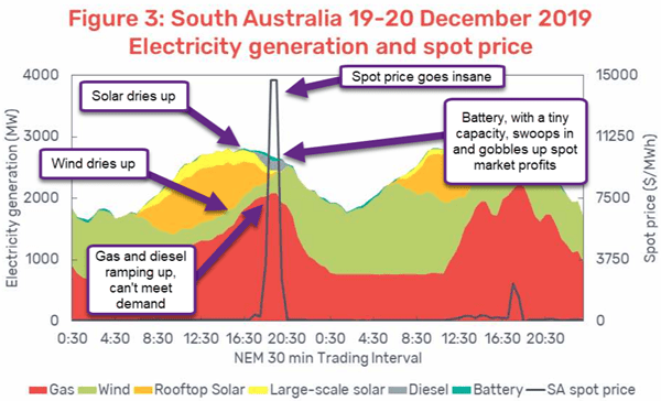 December 19th of 2019 was extraordinarily hot, so electrical demand for cooling was high. As the sun set, solar power generation dropped away. As luck would have it, winds were calm. This led to a shortfall in power generation as natural gas and diesel assets were ramping up. This, in turn, caused the spot price for electricity to jump briefly to $14,700/MWh. And who was in a position to claim that price? The big batteries at Hornsdale and Lake Bonney. In just two days, these batteries earned $1 million.