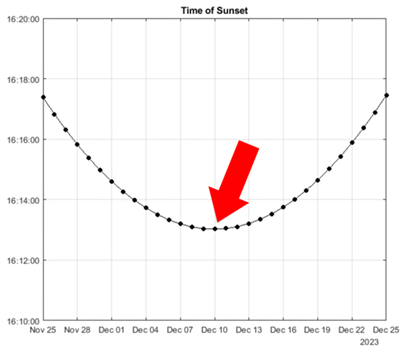 The shortest day of the year is December 21st, but the earliest sunset can be almost two weeks earlier, depending on your latitude. Where I am, today is the day of the earliest sunset: 4:13 PM.