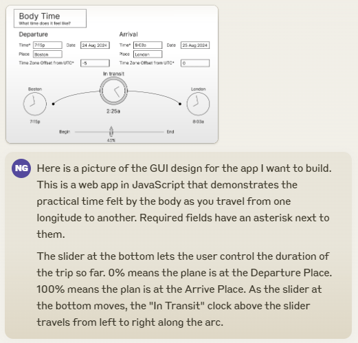 Amazingly, it worked! It took a lot of back and forth to get to the point where I was happy with the app, but I can honestly say I built this app without touching a single line of JavaScript, HTML, or CSS. Here is the result. I call it Body Time, because I think of it as representing the time felt by the body as you travel. In the sample flight, you can see that the clock time experienced on the plane flying from Amsterdam to New York is much slower than real time. This is because, by chasing the sun, we’re lengthening the day.